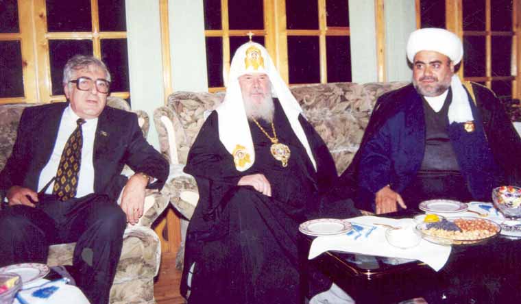Turkiyenin kecmish prezidenti Suleyman Demirelle Umumrusiya patriarxi II Aleksi ve Seyxulsilam A.Pasazade ile